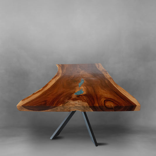 Exquisite live edge dinning table carved from acacia wood with a beautiful turquoise detail