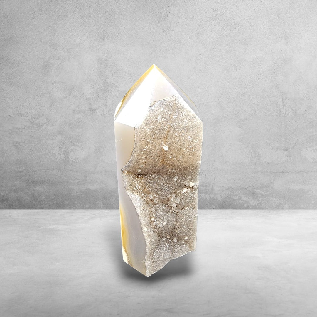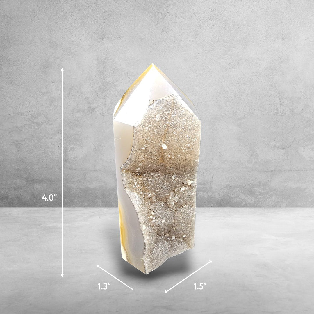 This Druzy Agate Tower is an alluring small decorative piece featuring stunning sparkling crystals and terracotta waves. Its unique beauty and mystic energy make it the perfect addition to any space.