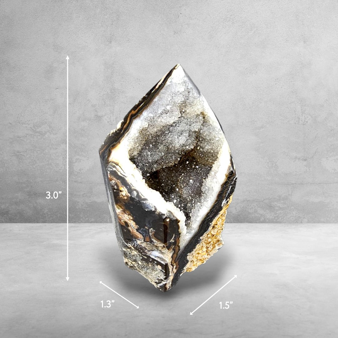 This unique Druzy Agate Tower is the perfect accent piece for your home. With its black and gold bands and inner crystals from Brazil, it will add a touch of warmth and dazzle to any room.