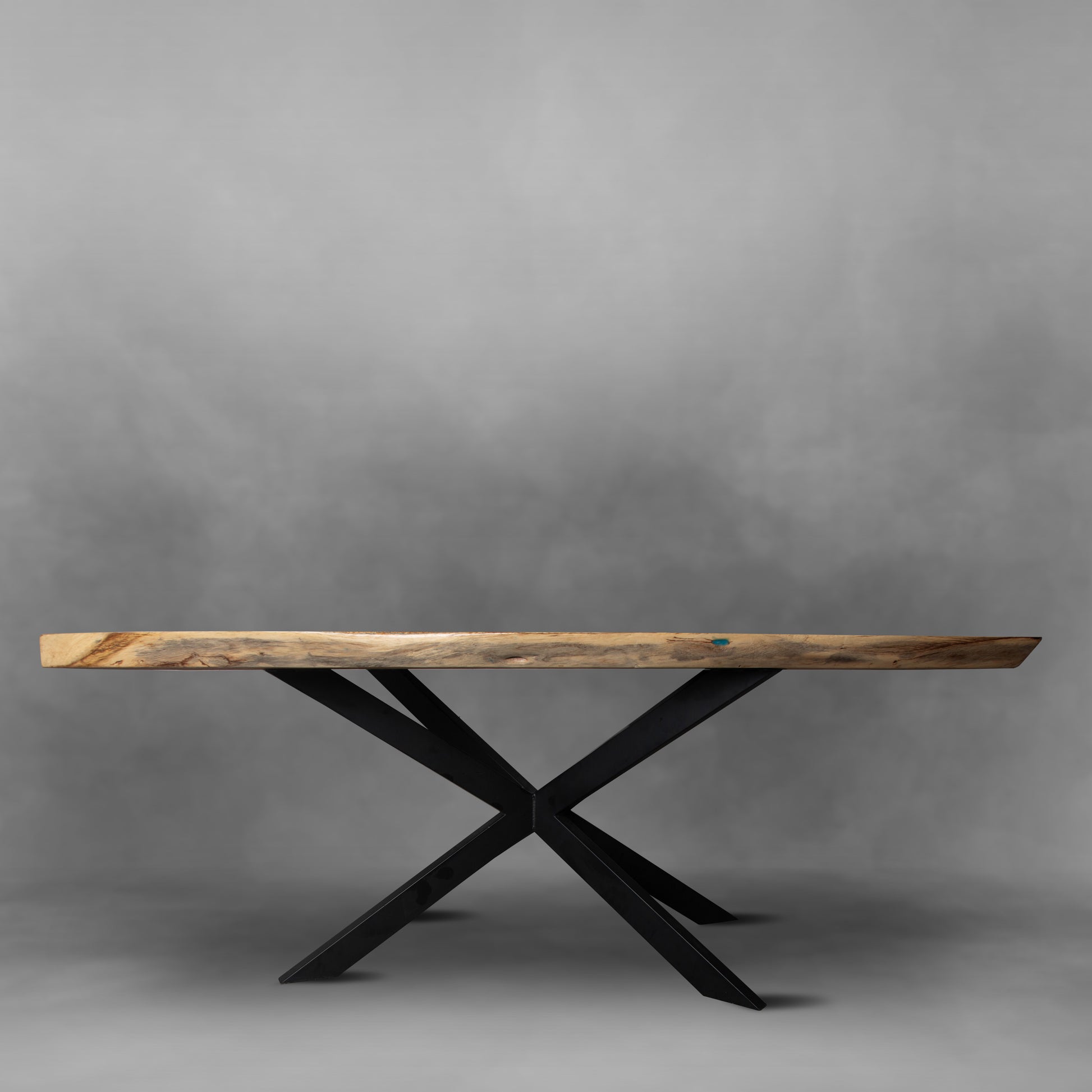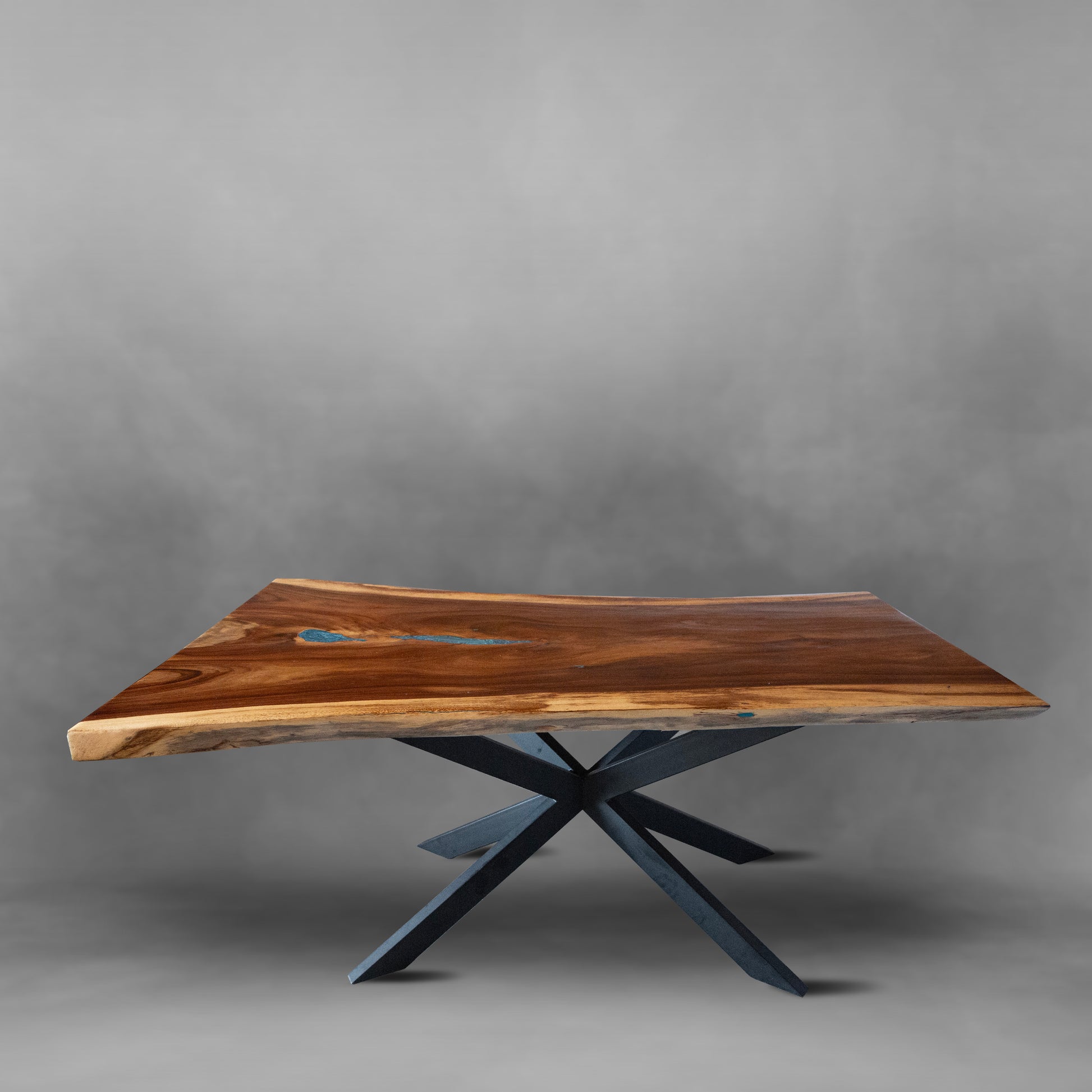 Exquisite live edge dinning table carved from acacia wood with a beautiful turquoise detail