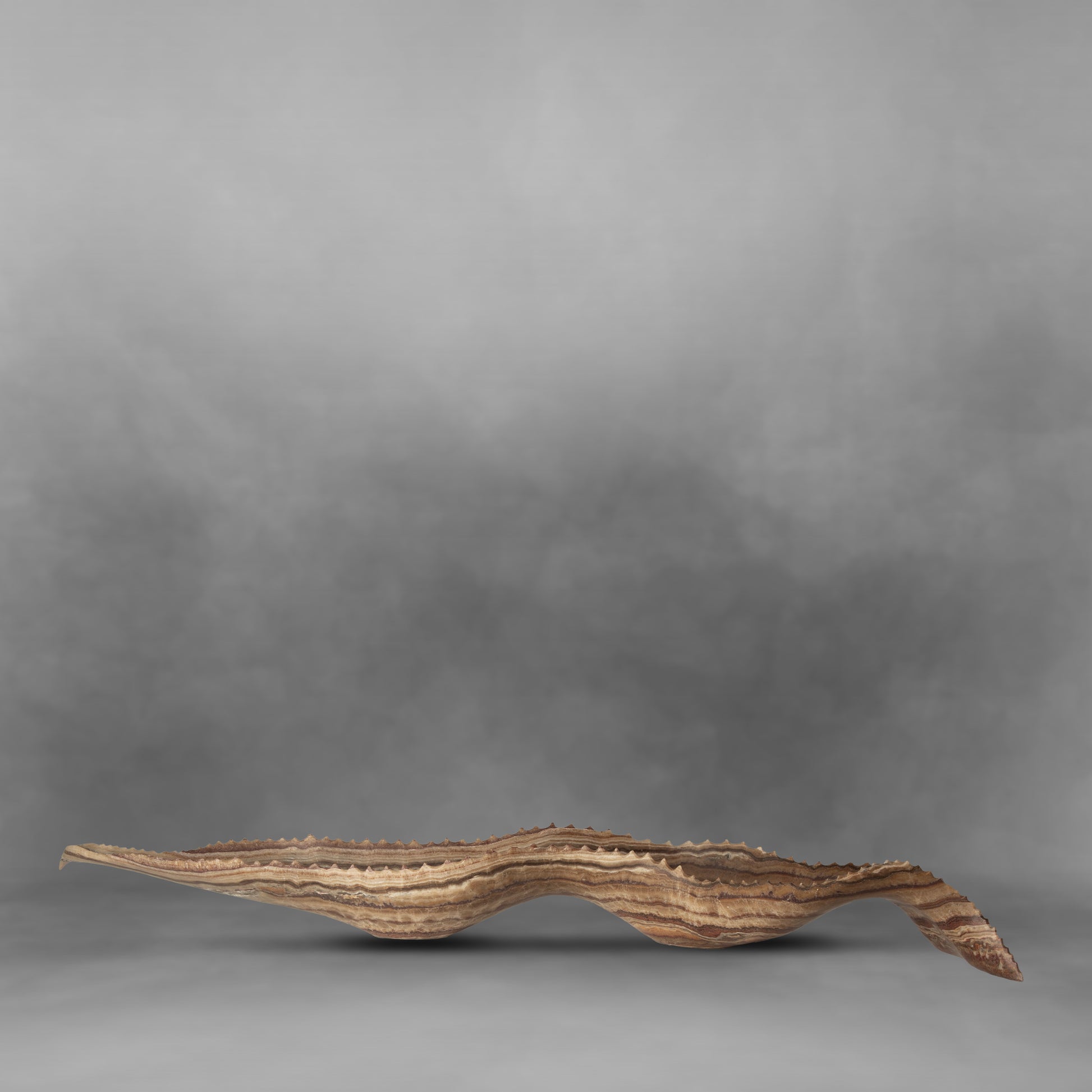 This unique Sharp Teeth canoe form is beautifully crafted with brown gradients in a large onyx bowl. Its unique design and material make it an ideal distinctive statement piece in any home.