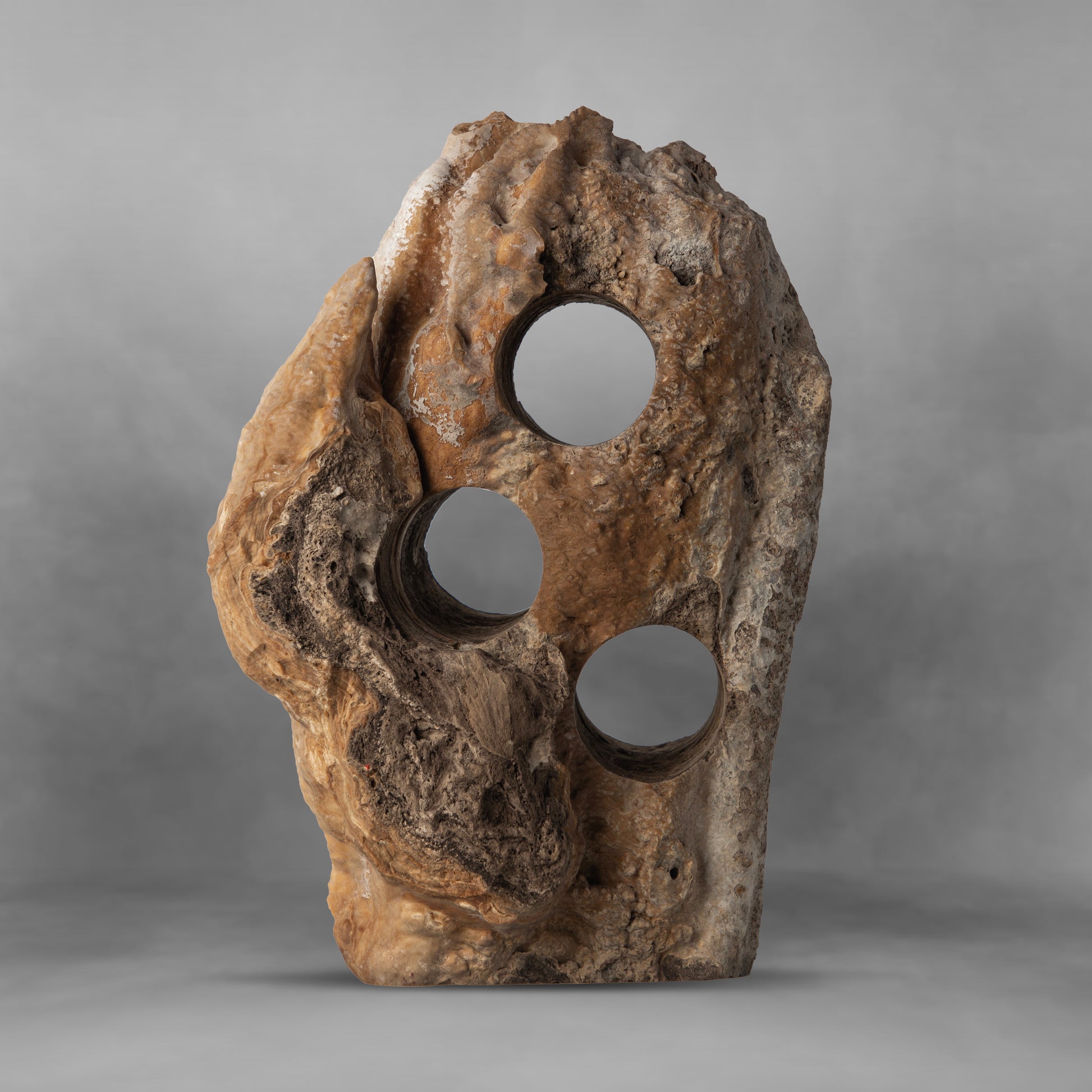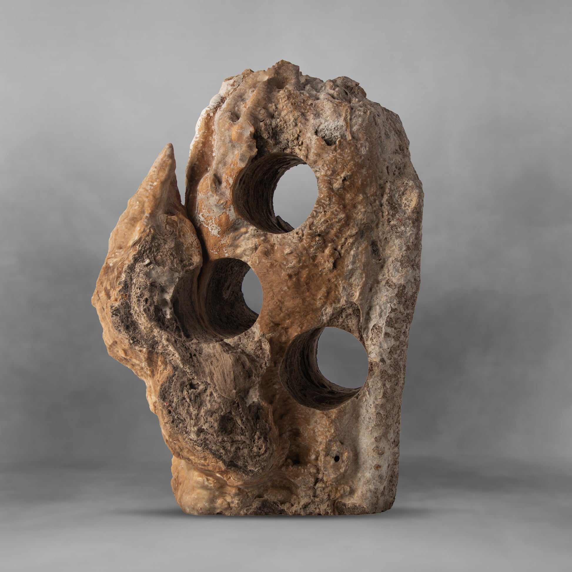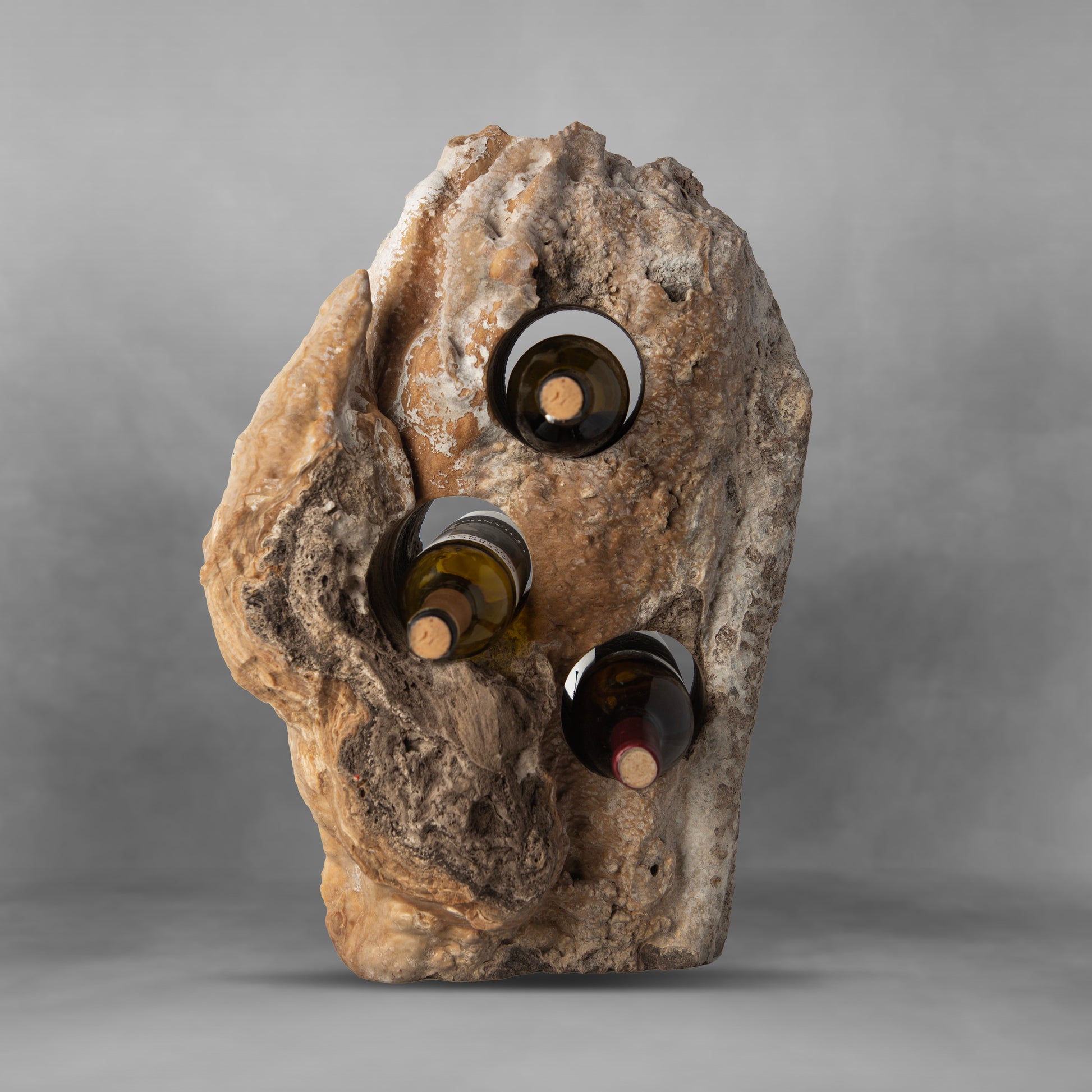 Stalagmite, rough stone in brown and gray, appealing onyx wine rack, 3 bottles